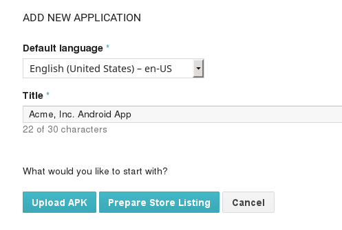 This opens the Add New Application screen. Click the Prepare Store Listing button. (Note that as you navigate the various screens, you can click the Save Draft button to preserve your changes.)